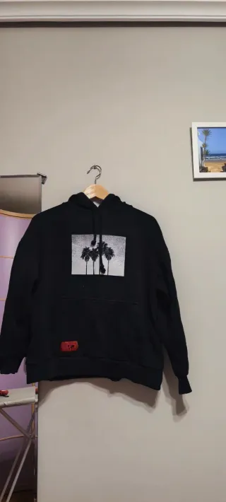 Sudadera negra con estampado fotográfico de palmeras en el frontal. Detalle de texto en manga. Talla Xs es grande de talla. 98% algodón 2% elastano Bolsillos canguro y choto con cordón. - Estampado de palmeras en blanco y negro. - Inscripción en la manga izquierda. Medidas: Contorno pecho:110cm Largo:55cm