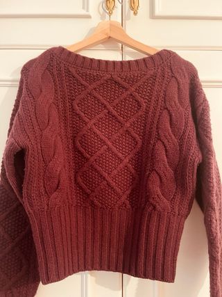 Jersey de punto grueso con un diseño trenzado muy bonito. Destaca por su original broche de pedrería. - Color granate. - Cierre de botones. - Manga larga.