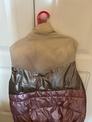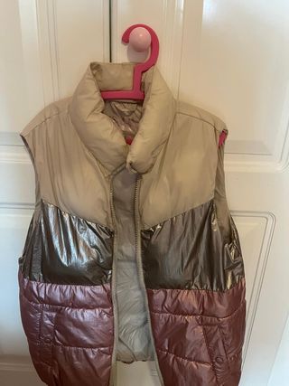 Chaleco de invierno con un diseño moderno y tres colores. - Parte superior en color beige. - Sección central en tono dorado. - Parte inferior en rosa con acabado brillante y acolchado.