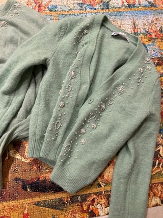 conjunto jersey y chaqueta verde pastel de zara con abalorios . talla s