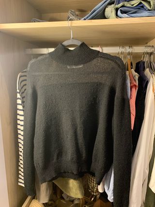 Jersey negro de cuello alto con un diseño transparente. - Tejido ligero y suave. - Cuello de canalé. - Manga larga.