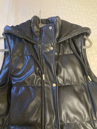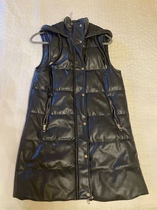 Chaleco largo efecto piel, con capucha y cierre de cremallera. - Diseño acolchado. - Bolsillos frontales con cremallera. - Cierre central con botones a presión. Aunque la talla es XS, talla grande, yo llevo una S, incluso M en alguna prenda y queda perfecto.