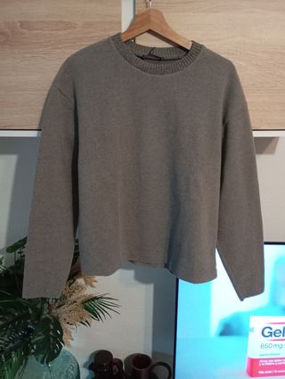 Jersey de punto Zara en color verde oliva. Es un básico perfecto para cualquier ocasión. - Cuello en pico. - Manga larga. - Tejido acanalado.