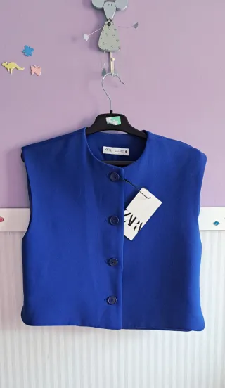 Chaleco corto de Zara en un llamativo color azulón. Perfecto para añadir un toque de estilo a cualquier conjunto. - Cuello redondo y manga sisa - Cierre de botones. - Corte cropped. - Aberturas laterales