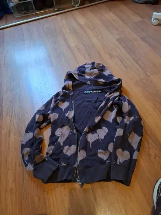 Sudadera con capucha y un llamativo estampado de corazones en tonos morados. Perfecta para un estilo casual. - Diseño con capucha. - Cierre de cremallera frontal. - Puños y bajo elásticos.