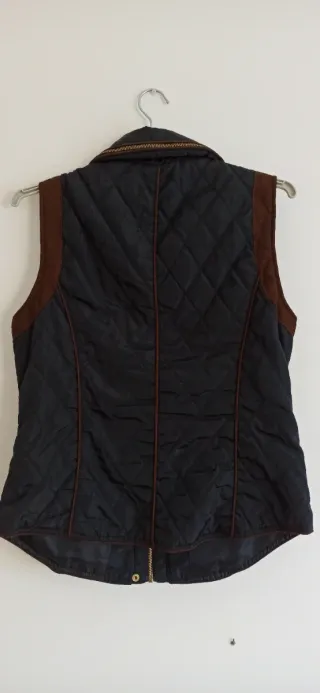 Chaleco acolchado marino de Zara con detalles en marrón. - Cierre de cremallera frontal. - Bolsillos con cremallera. - Cuello alto. - En el cuello va un gorro plegado cerrado con cremallera.