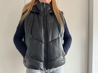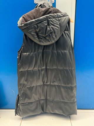 Chaleco largo de Zara en color negro. Diseño acolchado con capucha. - Cierre de cremallera frontal. - Bolsillos laterales con cremallera. - Cordones ajustables en la capucha. uno de los botones inferiores no funciona, ver foto detalle