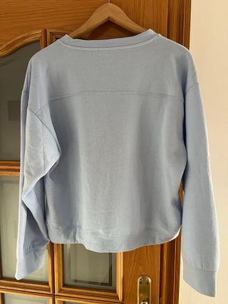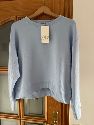Sudadera de Zara en color azul, con etiqueta. - Cuello redondo. - Manga larga. - Bajo con corte asimétrico.