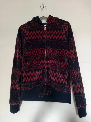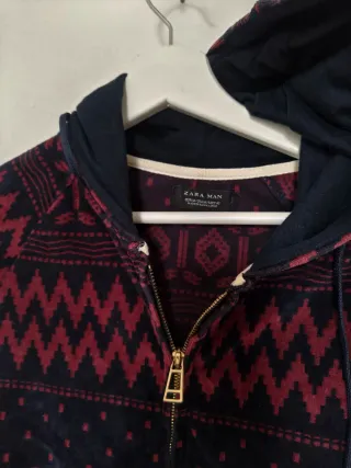 Sudadera con capucha de Zara con un diseño estampado en tonos azules y rojos. El tejido es de terciopelo, lo que le da un tacto suave y agradable. - Cierre de cremallera. - Capucha. - Bolsillos delanteros.