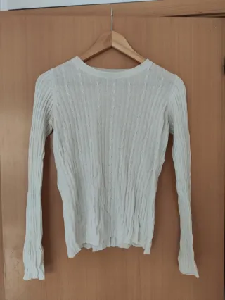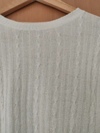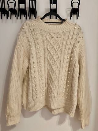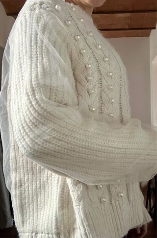 Jersey ZARA con tul en color crudo/beige claro. Combina punto trenzado con perlas decorativas, mangas y parte trasera de tul transparente ligeramente abullonadas. Cuello y bajo en canalé. Talla S/M, se ajusta bien a una S o M pequeña. En muy buen estado; a destacar que uno de los puños tiene dos pequeños agujeritos en el tul exterior, solo en la capa trasera y no se aprecian al llevarlo puesto.