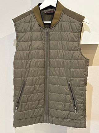 Chaleco acolchado de Zara en color verde oliva. Presenta un diseño moderno y funcional. - Cuello redondo con acabado elástico. - Cierre frontal de cremallera. - Dos bolsillos laterales con cremallera.