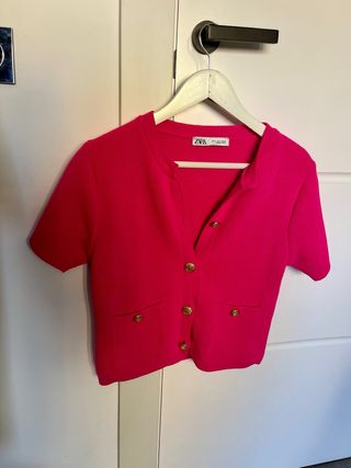 Cárdigan rosa de color intenso de ZARA con botones dorados.