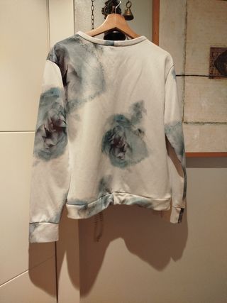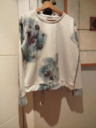 Sudadera de Zara con un bonito estampado floral y detalles de pedrería. - Diseño multicolor sobre fondo blanco. - Manga larga. - usada pero muy buena condiciones