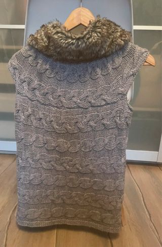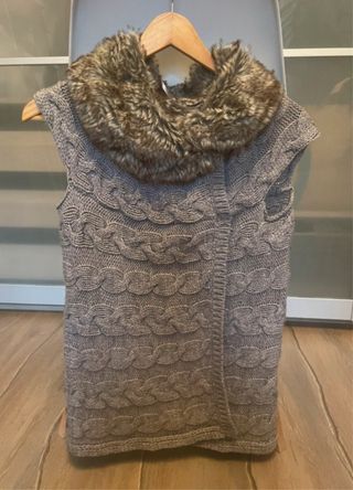 Chaleco de punto gris con cuello de pelo sintético. - Diseño de trenzas. - Cierre cruzado. - Sin mangas.