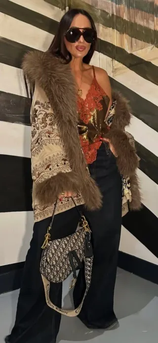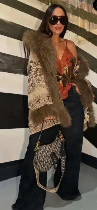 Elegante chaleco de terciopelo con bordados y detalles de pelo. - Diseño con motivos florales y paisley. - Acabado en negro y dorado. - Ribete de pelo sintético.