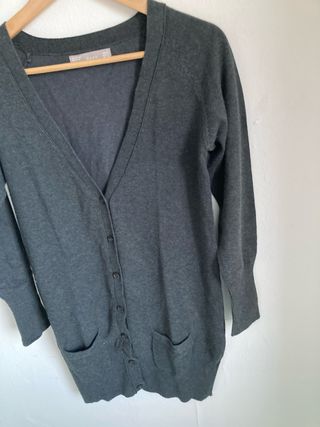 Cárdigan largo de punto con cuello ancho y botones. - Diseño abierto. - Puños y bajo de canalé. - Largo hasta la rodilla.