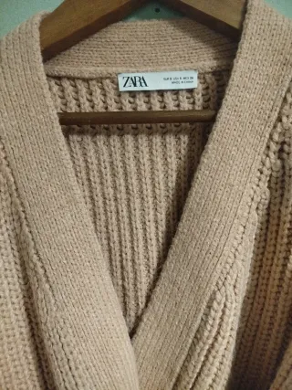 Caftán de punto de Zara, perfecto para el invierno. Su diseño es elegante y cómodo. - Tejido con estampado geométrico en tonos marrones y dorados. - Diseño abierto con cuello - Mangas largas abullonadas con puño - Largo hasta la rodilla