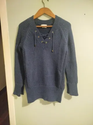 Jersey de punto azul con un diseño moderno y detalles únicos. - Cuello en V con cordones y ojales dorados. - Mangas largas con puños acanalados. - Tejido de punto grueso.