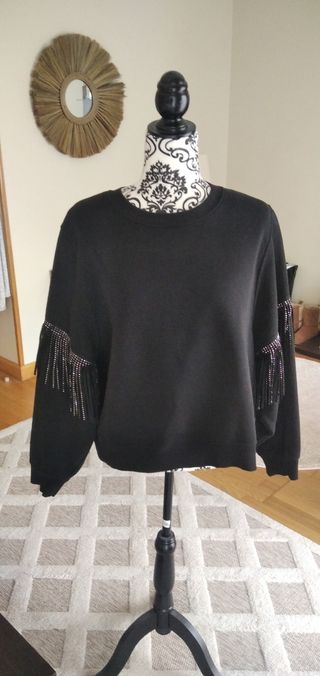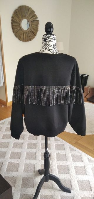Sudadera de Zara afelpada por dentro, calentita, en color negro, con flecos con brillantes en las mangas y toda la parte trasera de la sudadera, muy original. Marca una talla L, pero es overside, como una XL. 🌺Medidas: 61-62 cm de pecho (de axila a axila). Segunda mano, impecable. Zara, Cortefiel, Only, El corte inglés, Sfera, Anabel Lee, Mango, Parfois, Misako, Springfield, Marta Barcala, Kaaus, etc
