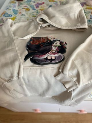 Sudadera morada con capucha, corta, con cintura fruncida. Usada en una ocasión