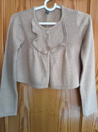 Rebeca corta de punto en tono dorado, con un diseño elegante y detalles de volantes. - Cierre de botones. - Manga larga. - Tejido con hilo brillante.