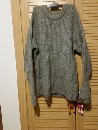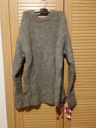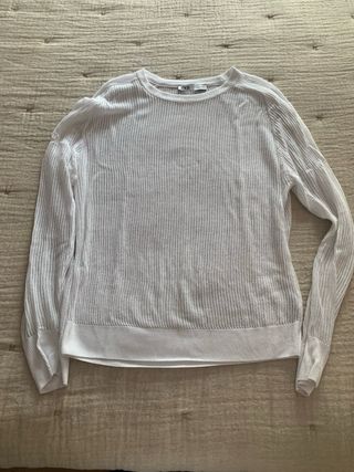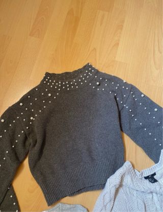 Jersey de perlas blancas solo por la parte de delante. Es finito de media manga en color gris claro jaspeado. Está en perfecto estado. Talla M, pero es bastante amplio, talla más bien para una L, hay medidas en las fotos