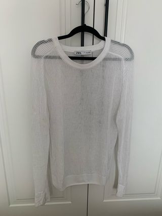 Jersey de Zara con un diseño de rayas clásico y elegante. Cuello tipo polo con botones. Tejido suave y cómodo. Corte Amplio/Regular. Poco uso muy buen estado
