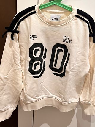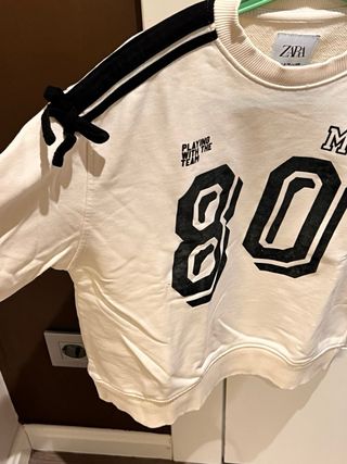 Sudadera de Zara con un diseño moderno y detalles únicos. - Color base beige con detalles en negro. - Número 80 grande en la parte delantera. - Inscripción PLAYING WITH THE TEAM y en la parte superior. - Tiras negras con lazos en los hombros.
