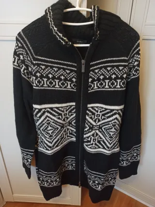 Chaqueta de punto de Zara Man con un diseño jacquard en blanco y negro. Es larga y se cierra con cremallera. - Diseño jacquard. - Cierre de cremallera. - Cuello alto.