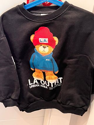 Sudadera negra con estampado de oso. - Talla 4 años - Diseño con gorro rojo y L.A.. - Estampado L.A. Outfit Urban Area en la parte inferior. - Detalle de capucha azul sobre el estampado del oso.