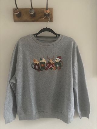 Sudadera gris con un divertido estampado navideño. - Diseño con tazas de bebidas calientes y elementos festivos. - Manga larga y cuello redondo.
