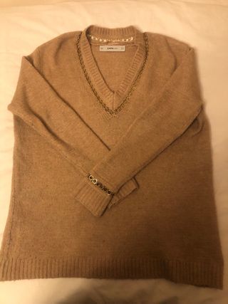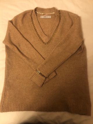 Jersey de Zara con un acabado peludo y detalles brillantes. - Diseño de manga larga. - Cuello redondo. - Tejido suave y ligero.
