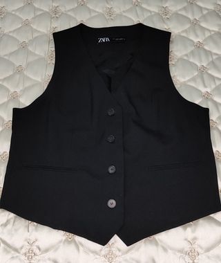 Elegante chaleco sin mangas de Zara en color gris perla. Ideal para darle un toque sofisticado a cualquier atuendo. - Talla L (equivalente a 40 o 12). - Confeccionado en satén, con un brillo sutil. - Cierre de botón. - Bolsillos funcionales.