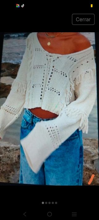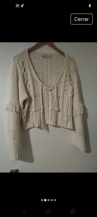 Precioso jersey de punto de Zara, color beige, talla M. Es nueva, sin etiqueta. - Diseño de punto calado. - Detalle de flecos. - Corte cropped.