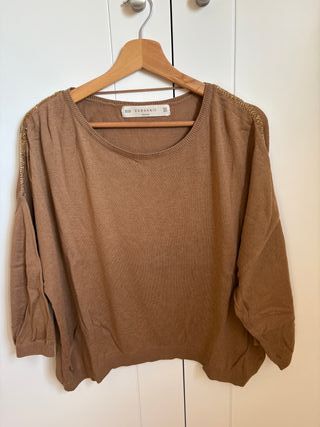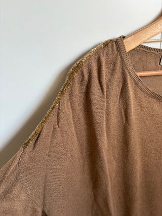 Jersey fino de punto en color marrón, con un detalle de abalorios en los hombros. - Diseño de cuello redondo. - Manga larga. - Tejido ligero y suave.