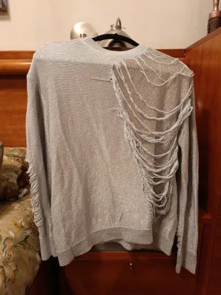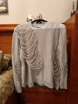Jersey de punto fino en color beige, con un diseño desgastado y detalles rasgados. Solo estrenado... Le quité la etiqueta interior porque me picaba. Con efectos de rotura que le da su punto al jersey. Vamos que la prenda es así... No está roto. - Cuello redondo. - Manga larga.