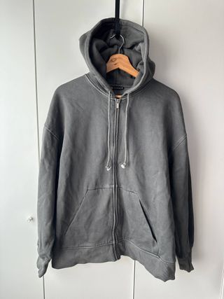 Sudadera gris de Zara con un diseño oversize y capucha grande. - Cremallera frontal completa. - Bolsillo canguro. - Cordones ajustables en la capucha.