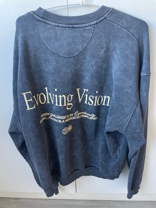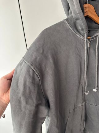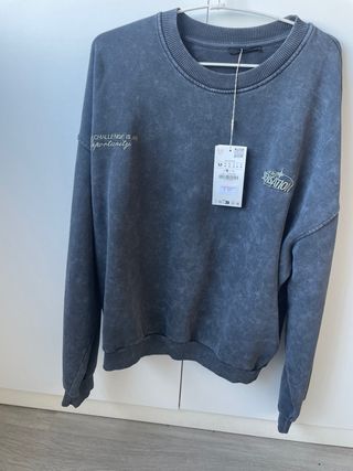 Sudadera gris de Zara, con un diseño moderno y un acabado desgastado. - Talla M. - Sin usar, con etiquetas. - Detalle de estampado en la parte delantera y trasera.