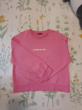 Sudadera de Zara con un mensaje divertido. - Color rosa vibrante. - Estampado Confidently 99% en blanco. - Cuello redondo y manga larga.