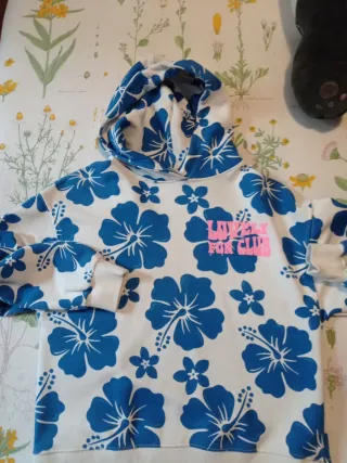 Sudadera con estampado de flores azules sobre fondo blanco. Presenta un diseño llamativo y juvenil. - Estampado floral grande y pequeño. - Capucha. - Detalle de texto Lovely For Club en rosa.