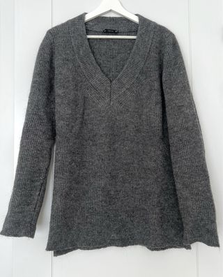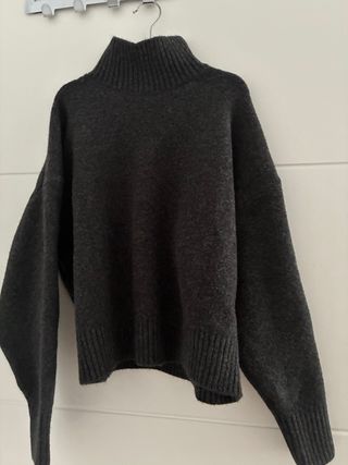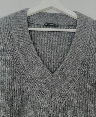 Jersey de punto oversize de Zara en color gris. Su corte holgado lo hace muy cómodo y versátil. - Tejido suave al tacto. - Cuello redondo. - Manga larga. Está en muy buen estado. Puede tener alguna bolita del punto, pero se enviará cepillado.