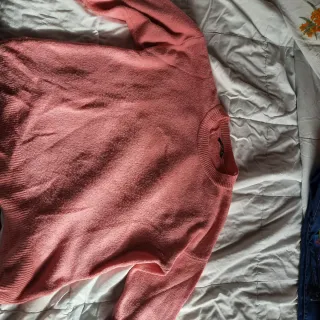 Jersey de punto fino en color rosa, con cuello en pico y un diseño de canalé que le da textura. - Manga larga. - Bajo asimétrico. - Detalle de costuras en relieve en la parte delantera. Precio 4.50 euros no negociables ◾ No acepto ofertas ◾ Solo venta a traves de envíos ◾ Contesto rápido y envío en menos de 24 horas ( De lunes a viernes)