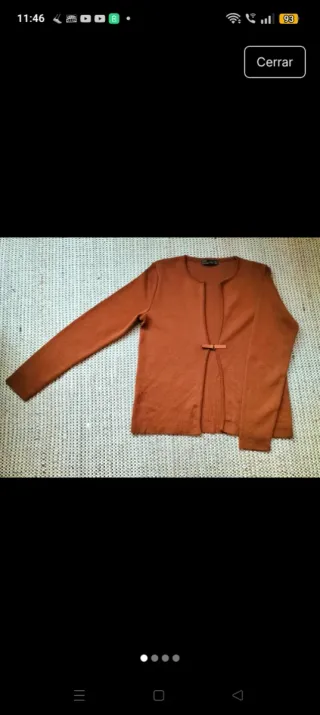 Rebeca de punto de la marca Zara en color tostado. Presenta un diseño abierto con un detalle de cierre en la parte delantera. - Manga larga. - Cuello redondo.Usado una vez; como nueva. Rebeca 50% lana y 50% acrílico. Color tostado.