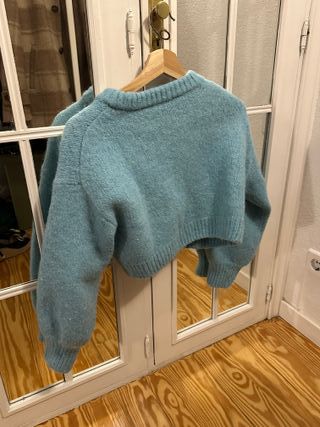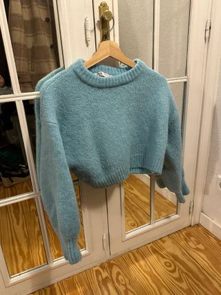 Suéter de punto azul de Zara, con un diseño moderno y cómodo. - Tejido suave con mezcla de lana. - Corte cropped. - Cuello redondo.