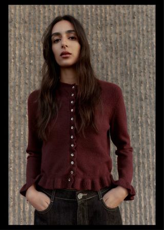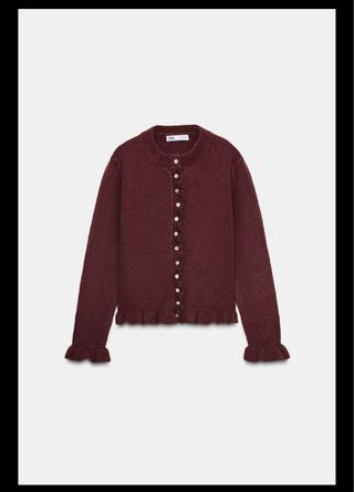Chaqueta de punto con volantes en mangas y bajo. - Cierre de botones. - Cuello redondo.