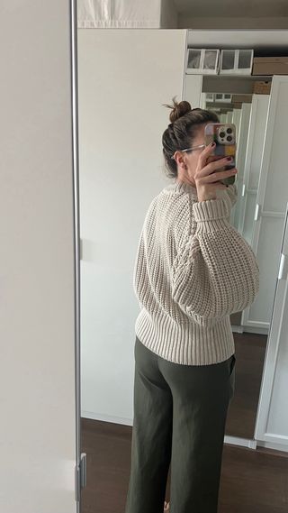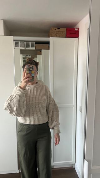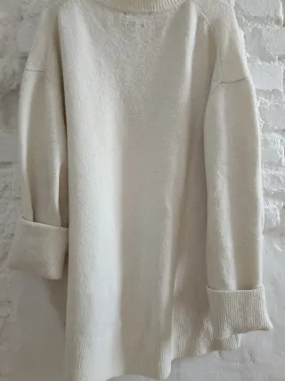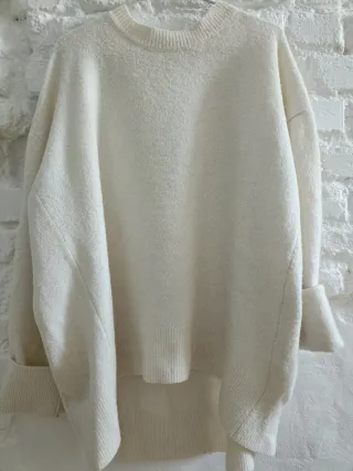 Jersey de Zara de corte oversize en color crema. Su tejido es suave y agradable al tacto. - Diseño holgado. - Cuello redondo. - Puños y bajo acanalados.