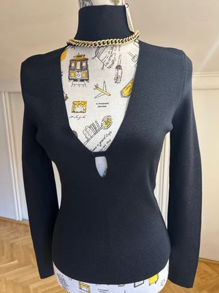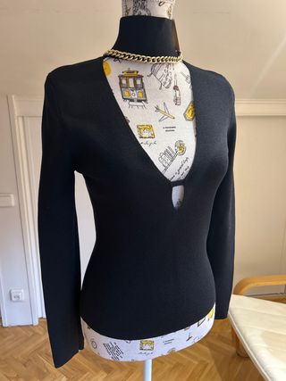 Jersey de punto fino con un diseño elegante y moderno. - Escote en pico pronunciado. - Detalle de corte en la parte delantera. - Manga larga. - Adornado con un collar tipo cadena dorada.
