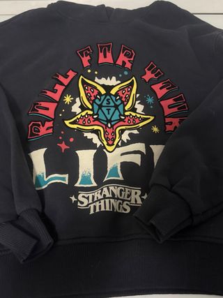 Sudadera con estampado de Stranger Things y temática de Dungeons & Dragons. - Diseño frontal con el Demogorgon y un dado. - Texto Friends Don't Lie y For Ever. - Logo de Stranger Things en la parte inferior.