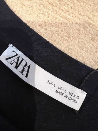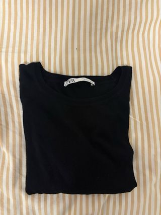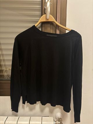 Jersey de manga larga en color negro de la marca Zara. Un básico versátil para cualquier ocasión. - Cuello redondo. - Bajo con aberturas laterales. - Tejido ligero y suave.