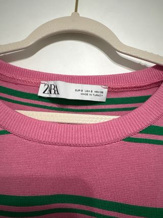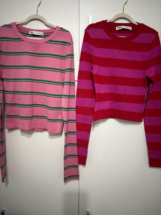 Conjunto de dos jerséis de Zara con un diseño de rayas. - Jersey rosa con rayas verdes. - Jersey rojo con rayas fucsia.